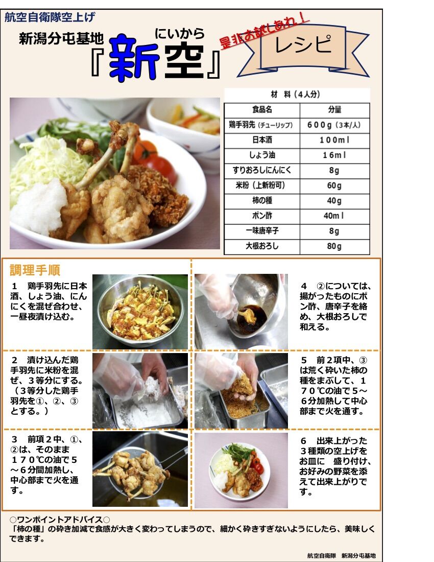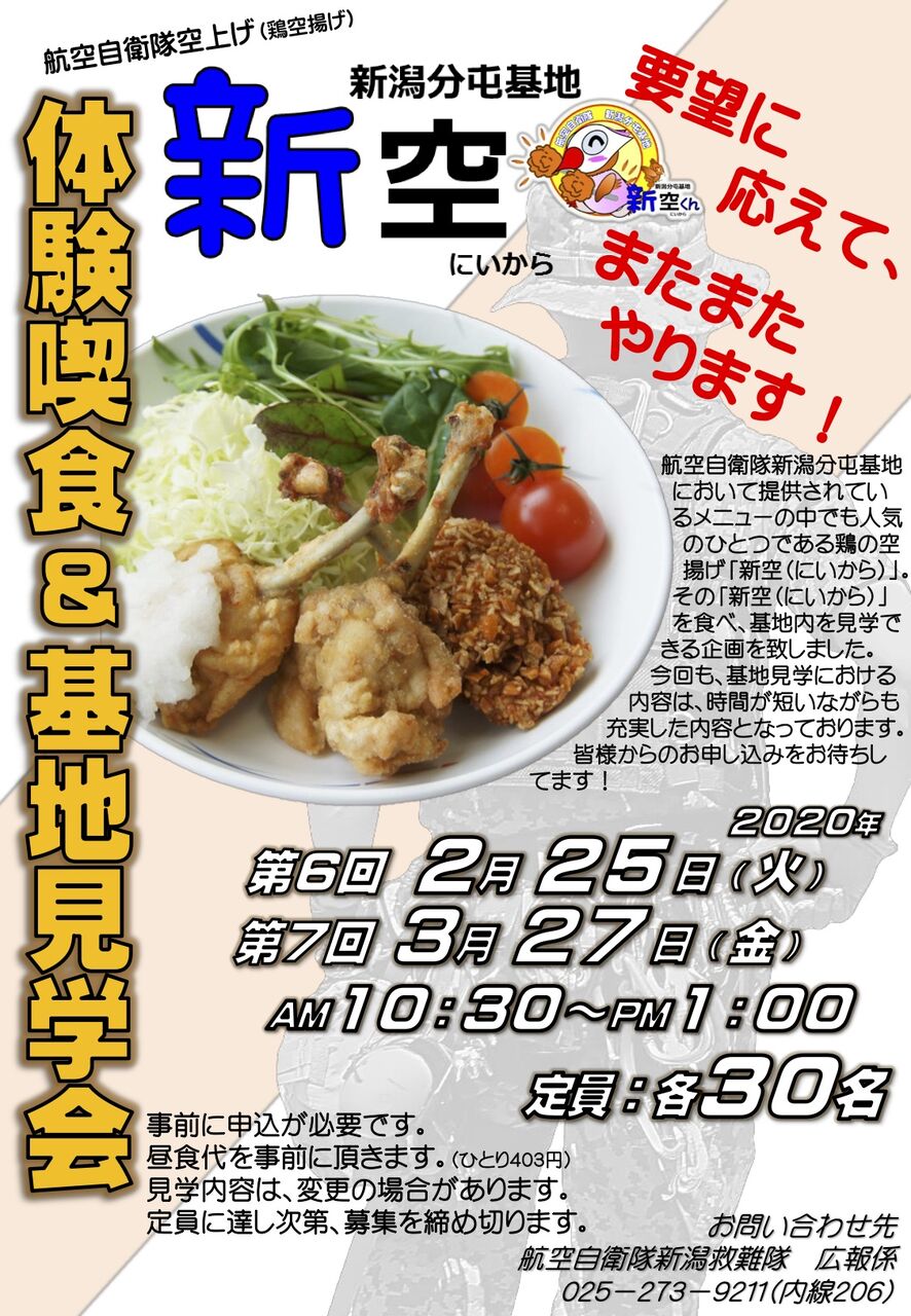 申込開始!大好評イベント今年も開催!『航空自衛隊 新潟分屯基地』で『航空自衛隊空上げ(鶏唐揚げ)の『新空(にいから)』喫食&基地見学会』開催。2月25日、3月27日。 - 株式会社ユニークワン