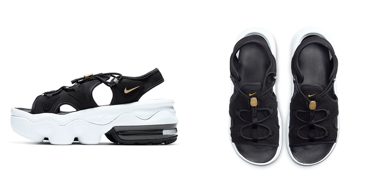 特徴はかかとの“マックス エア バッグ”と、“ヴェイパーマックス(VAPORMAX)”を連想させる波打った形状の前足部だ。厚みのあるチャンキーソールのサンダルに仕上げ、女性向けのシルエットやバランスを取り入れた。シューレースは手軽に着脱が可能。カラーはゴールドのスウッシュがアクセントのブラックと、全てのパーツを白で仕上げたホワイトの2色を用意する。