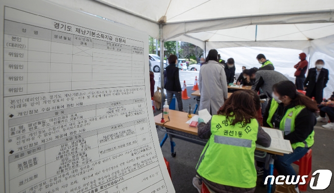 | 경기도 재난기본소득 현장접수일인 지난 4월21일 오후 경기도 수원시 권선구 권선1동 행정복지센터를 찾은 시민들이 줄을 서 있다. 2020.4.21 /뉴스1 © News1 이재명 기자 |