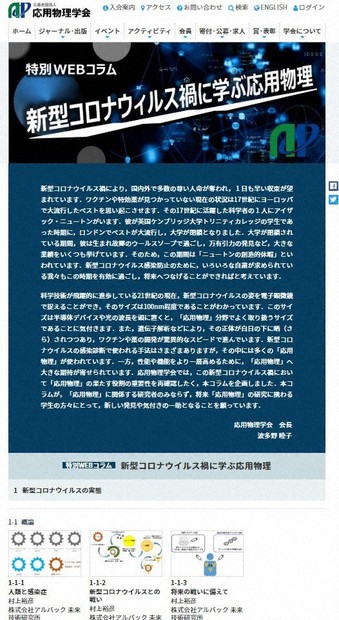 新型コロナウイルス対策のあちこちに使われている物理学について解説する応用物理学会のウェブコラムが、専門的な内容にもかかわらず7月の連載開始以来、約1万件のアクセスを集めてひそかな人気になっている。非接触の体温測定や飛沫(ひまつ)の拡散予測など、物理学を用いた対コロナ技術は多岐にわたる。同学会は「時間ができる夏休み。コラムを読んで応用物理のことを知ってほしい」と呼びかける。