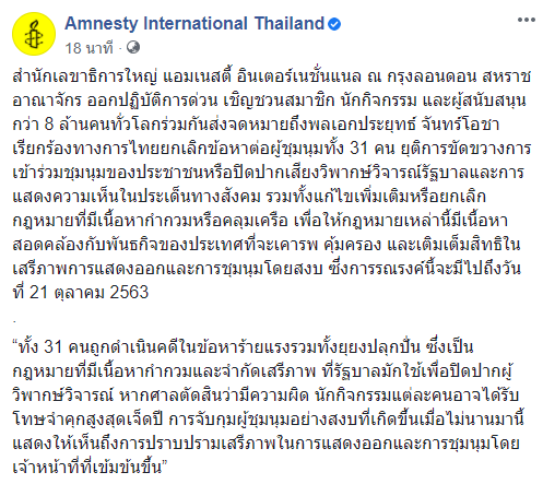 วันที่ 4 กันยายน 2563 ผู้สื่อข่าวรายงานว่า ที่เพจเฟซบุ๊ก Amnesty International Thailand ได้โพสต์ข้อความว่า