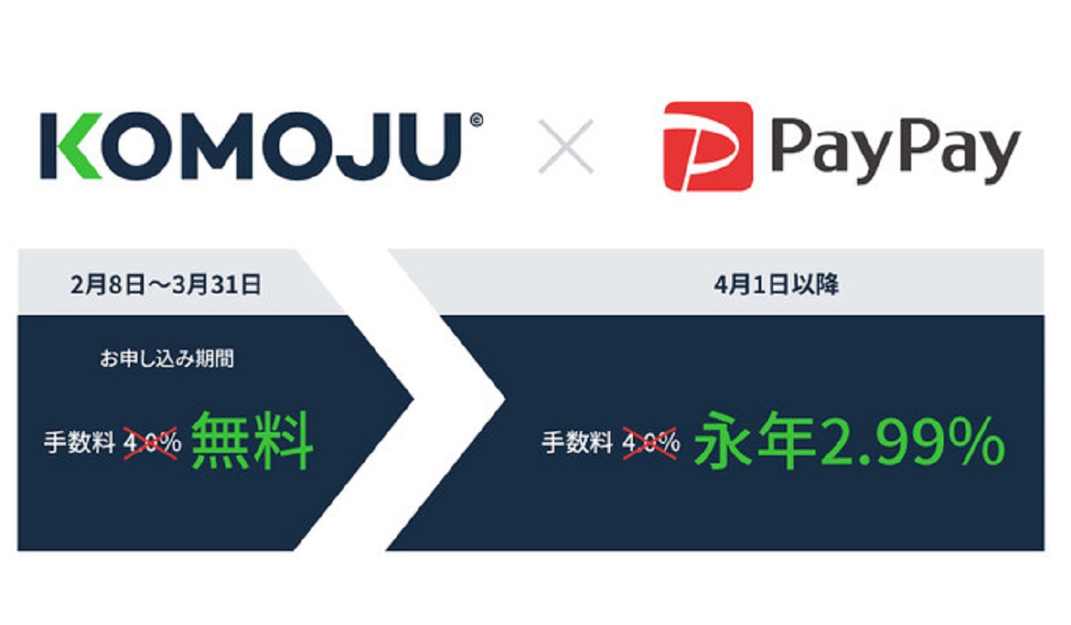 キャンペーンでは、2021年3月31日までにKOMOJUでPayPayを申し込むと、PayPayの決済手数料を通常4.0%のところ永年で2.99%となるという。さらに同キャンペーン申し込み期間の2021年2月8日~3月31日までの間のPayPayの手数料については無料となる。