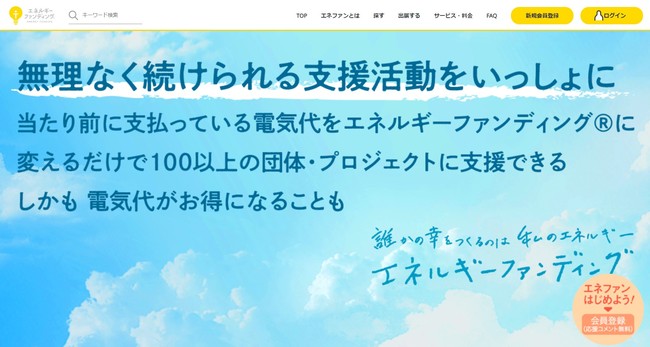 「エネルギーファンディング®︎」は、誰しもが毎月支払う電気料金の一部を、社会活動や誰かの夢・目標の支援(寄付)に変える仕組みです。電気料金や発電・送配電をはじめとする電気の品質は今までと変わらずに、手軽に継続した支援を行うことができます。社会貢献活動団体など約100社が参画しており、好きな団体を選んで支援することが可能です。ウェブフォームからのお手続きとなり、全国(沖縄を除く)からお申込み可能です。
