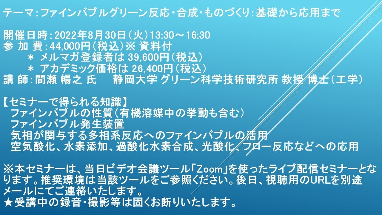 からの記事と詳細 ( 【ライブ配信セミナー】ファインバブルグリーン反応・合成・ものづくり:基礎から応用まで 8月30日(火)開催 主催:(株)シーエムシー・リサーチ - PR TIMES )